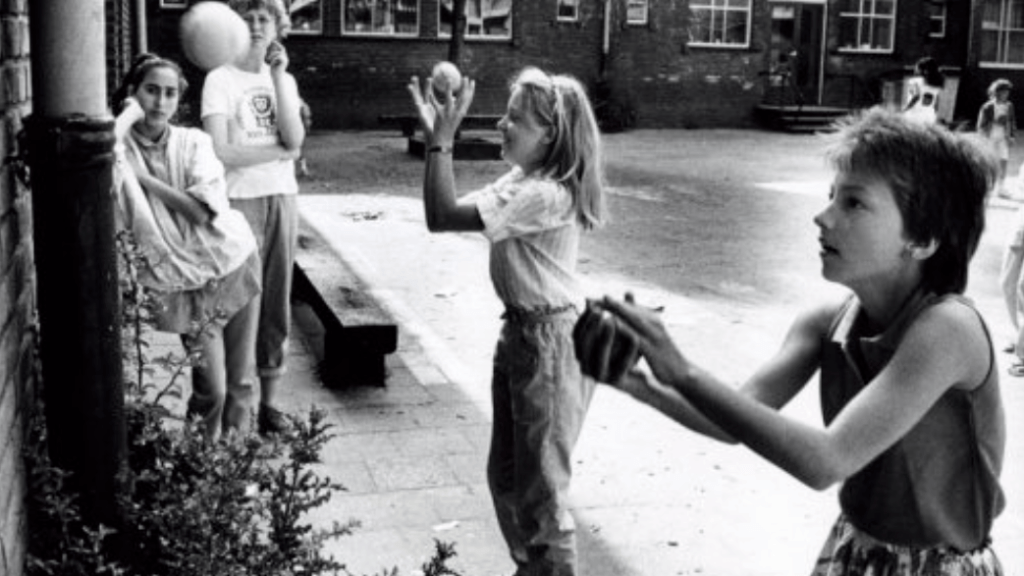 Bij het zien van dit leuke tafereel schakel ik pijlsnel ruim 50 jaar terug in de tijd. En alsof het gisteren was, zie ik ons als kleine kinderen spelen op de grote plaats achter het huis. Behendig springen en figuren draaien met de elastiek die strak gespannen staat om de kuiten van twee buurjongetjes. Of om vuilnisbakken bij gebrek aan beentjes. Ik zie ons urenlang schommelen en kaatsenballen. En maar oefenen en oefenen op het gooien met zes ballen tegen de muur. Want dat kon mijn moeder met zó veel gemak dat het toch echt wel te leren moest zijn. En natuurlijk touwtje springen: “In spin de boog gaat in. Uit spuit de boog gaat uit.” Soms deden de grote jongens uit de buurt mee en dan pakten ze twee touwen en draaiden die behendig door elkaar heen. En de kleintjes maar springen alsof ze nooit moe zouden worden.