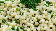 Meng de sojasaus en zoete chilisaus en marineer de coquilles hierin. Laat dit even staan terwijl je de andere onderdelen bereidt. Kook de parelcouscous volgens de instructie op het pak. Voeg de geweekte rozijnen toe aan de couscous en verwarm ze even mee. Snipper de ui en fruit deze aan, snijd of pers de knoflook en voeg deze toe. Snij de tomaten en voeg deze toe. Bak even alles goed door. Snij de zongedroogde tomaten en geroosterde paprikarepen klein en voeg toe. Voeg de bonenmix toe. Maak het prutje op smaak met wat (cayenne)peper en/of zout en/of kruiden naar eigen smaak. Verhit de pan. Bak de coquilles in de eigen marinade 2 minuten aan elke kant. Rooster de sesamzaadjes in een droge pan.