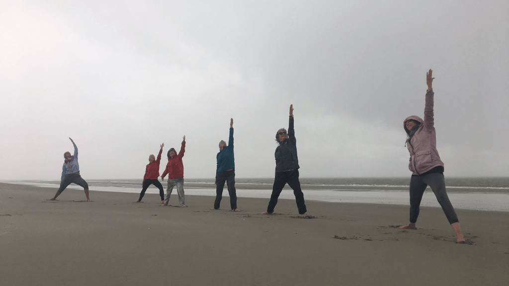 Langs de waterlijn, in het zand dat als een razende voort stuift, doen we eerst de Zonnegroet als eerbetoon aan alle elementen: het water, de aarde, de wind en de zon die voorlopig nog ontbreekt. Dan volgen de ademhalingsoefeningen om op zoek te gaan naar het stiltepunt in jezelf. “Want ook al raast alles om je heen en stormt het letterlijk of figuurlijk: je kunt altijd terugkeren naar je innerlijk stiltepunt. Dit rustpunt is er altijd voor jou“, bezweert de yogajuf.