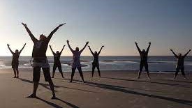 Het is nog vroeg in de ochtend als ik naar het strand fiets voor een lesje Yoga aan Zee. De lucht is grauw, het is behoorlijk fris en de wind waait op kracht 6 tot 7. Op het strand ontmoet ik 6 vrouwen. Waarom ontbreken bij dit soort activiteiten toch altijd de mannen? Ligt het aan het weerbericht dat precies voor mijn yoga-uurtje een flinke regenbui heeft voorspeld?