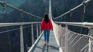 Kinderen huppelen voor mij uit. Geen benul van gevaar en al helemaal niet bang voor de angstaanjagende hoogte. Stoere mannen gaan luidruchtig en stampend over de brug. Springen bij het passeren plagend op en neer om de brug nog meer te laten schommelen. Vrouwen houden zich krampachtig vast aan de reling. Schuifelen vooruit en slaken onderdrukte kreetjes van angst. Ik doe stoer, stap stevig door zonder op of om te kijken, maar bij elke beweging van de brug draait mijn maag. Met een zucht van opluchting haal ik de overkant. Maar ik moet ook nog terug. Ik aarzel, draal, stel nog even uit. En dan besluit ik om héél langzaam terug te lopen en heel goed rond te kijken; alle angst ten spijt. Ik bewonder de mooiste wolkenluchten hoog boven mij. Ik richt mijn blik op de eindeloze verte. En ik kijk naar beneden; naar die donkere diepte onder mij. De folders liegen niet: het is machtig mooi én spectaculair. Bos, bos, bos. Overal bos. Zover je kunt kijken en nog veel verder dan dat.
