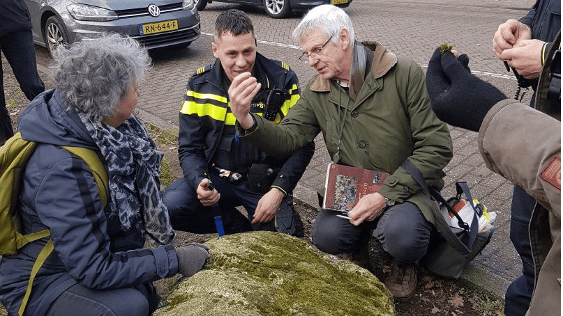 Als we halverwege de middag met vier zestigers gehurkt zitten bij een grote steen waar volgens Van Dort minstens vijf redelijk zeldzame mossen op te vinden moeten zijn, houdt naast ons een politiewagen stil. Het raam zakt en een van de agenten vraagt vol verbazing ‘waarom 4 senioren zo aandachtig een doodnormale kei bestuderen?’ Ik loop naar de auto en laat de mannen weten dat we op zoek zijn naar bijzondere mossen. “Het is een kwestie van geduld. Als je goed speurt, vind je vaak ook wat.”